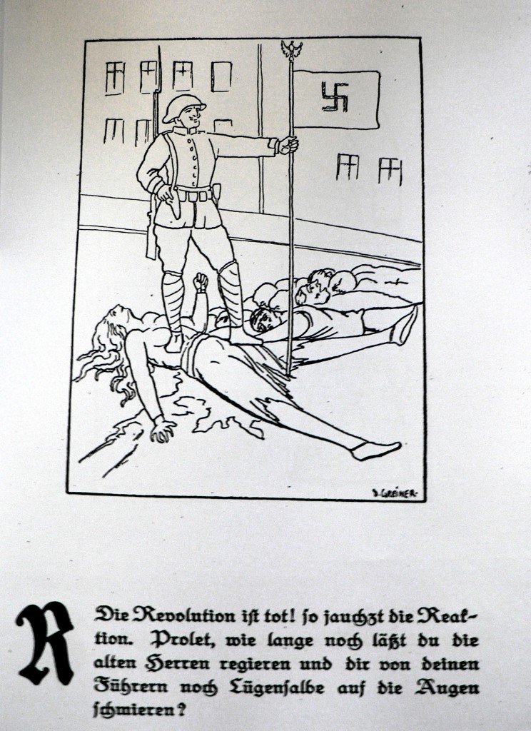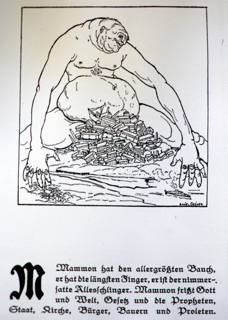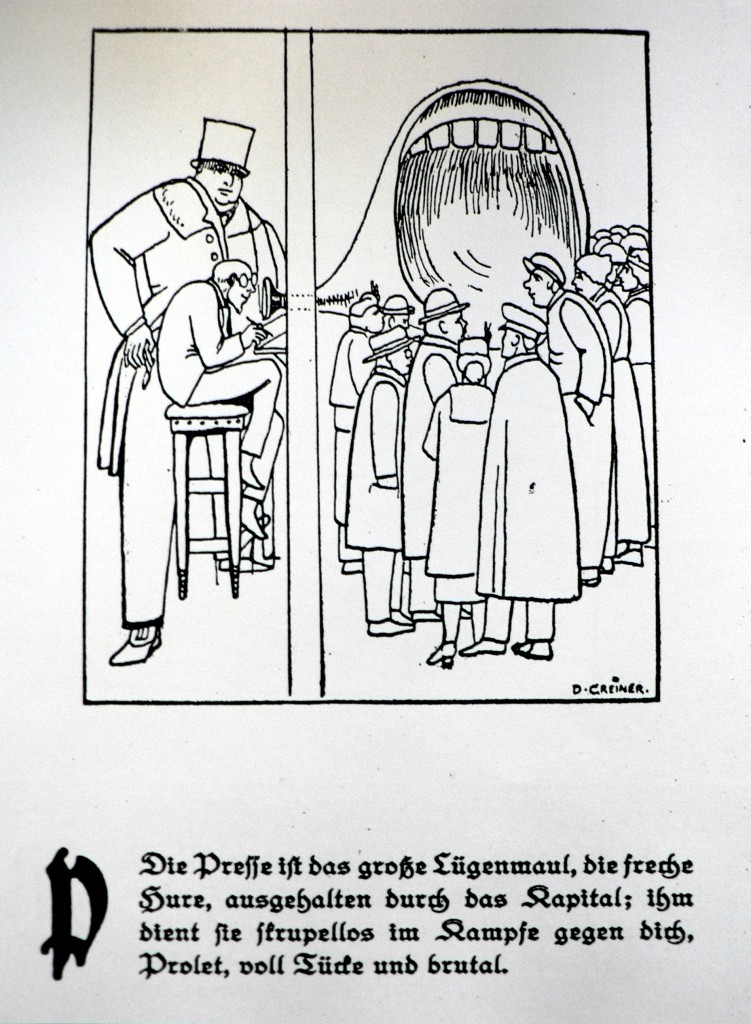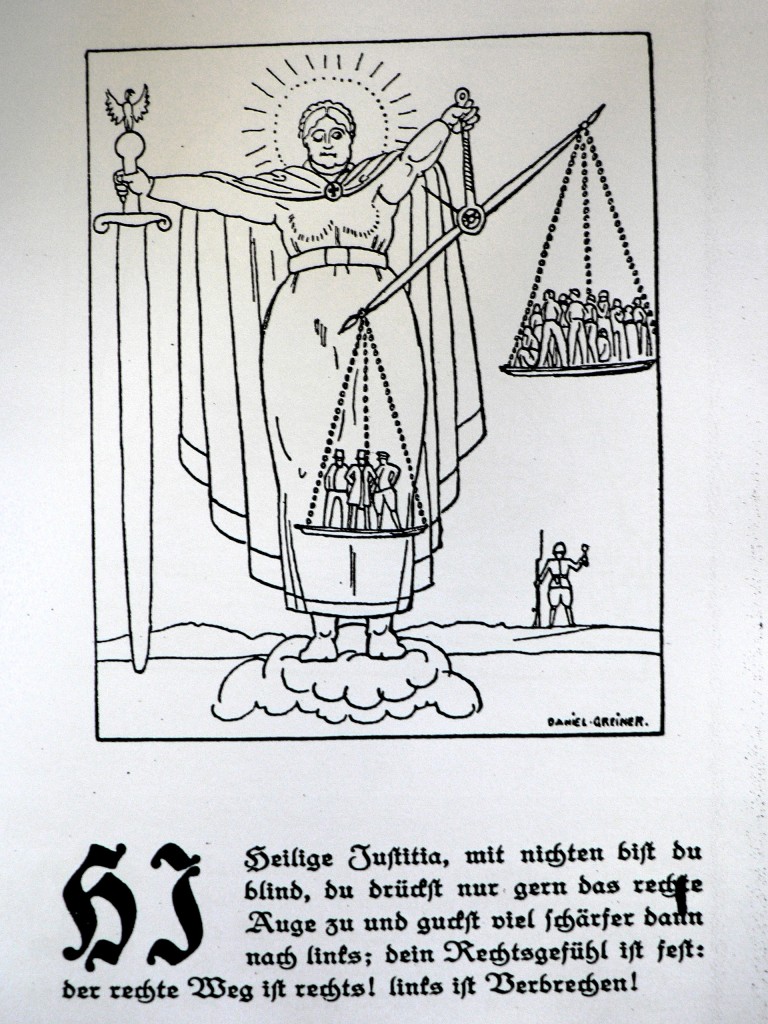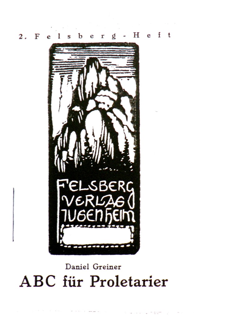 Daniel Greiner - ABC für Proletarier - Buchstaben HJ «Heilige Justitia, mit nichten bist du blind, du drückst nur gern das rechte Auge zu und guckst viel schärfer dann nach links; dein Rechtsgefühl ist fest: der rechte Weg ist rechts! links ist Verbrechen!» Daniel Greiner - ABC für Proletarier - Buchstabe M «Mammon hat den allergrößten Bauch, er hat die längsten Finger. er ist der nimmersatte Allesschlinger. Mammon frisst Gott und Welt, Gesetz und die Propheten, Staat, Kirche, Bürger, Bauern und Proleten.» Daniel Greiner - ABC für Proletarier - Buchstabe N «Mit Nationalismus, Vaterland und Fahnenstangen hat man dich immer wieder eingefangen; dein Vaterland reicht nicht vom Memelland zum Moseltale. Die Menschheit ist dein Vaterland: die proletarische Internationale.» Daniel Greiner - ABC für Proletarier - Buchstabe O «Opfer hat dein unentschlossener Kampf schon überviel gekostet, dein bester Kämpferstahl in Kerkermauern rostet. Moloch frißt Opfer immerzu / und du siehst zu in Ruh?» Daniel Greiner - ABC für Proletarier - Buchstabe P «Die Presse ist das große Lügenmaul, die freche Hure, ausgehalten durch das Kapital; ihm dient sie skrupellos im Kampfe gegen dich, Prolet, voll Tücke und brutal.» Daniel Greiner - ABC für Proletarier - Buchstabe R «Die Revolution ist tot! so jauchzt die Reaktion. Prolet, wie lange noch läßt du die alten Herren regieren und dir von deinen Führeren noch Lügensalbe in die Augen schmieren?» Daniel Greiner - ABC für Proletarier - Buchstabe V «Valutaschwindel bringt der Mark den Schwindsuchttod, dem Proletarier unerschwinglich Brot.»